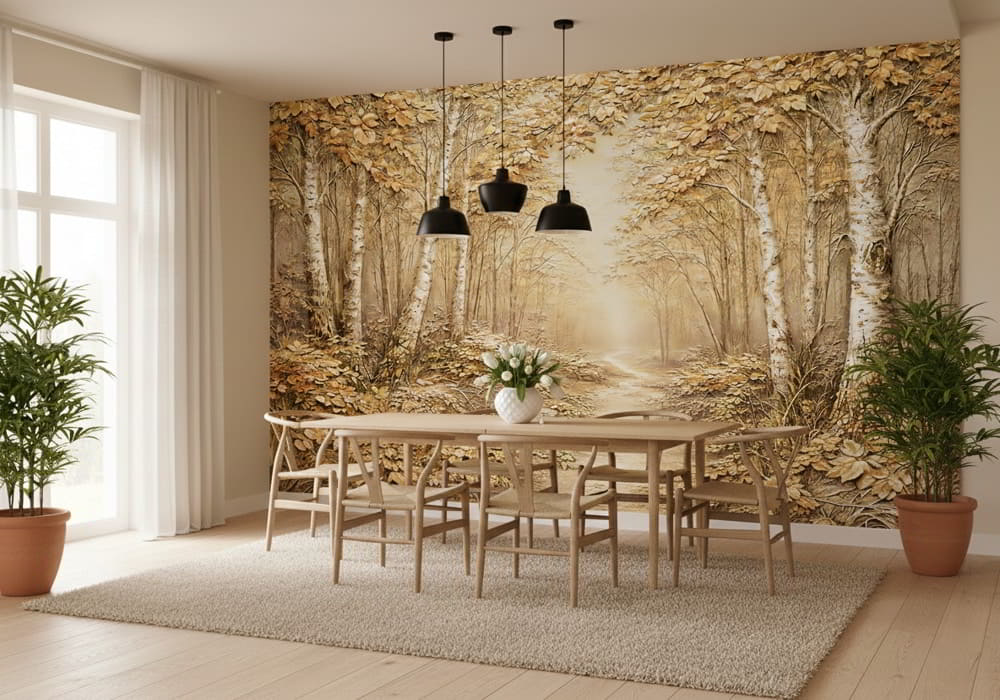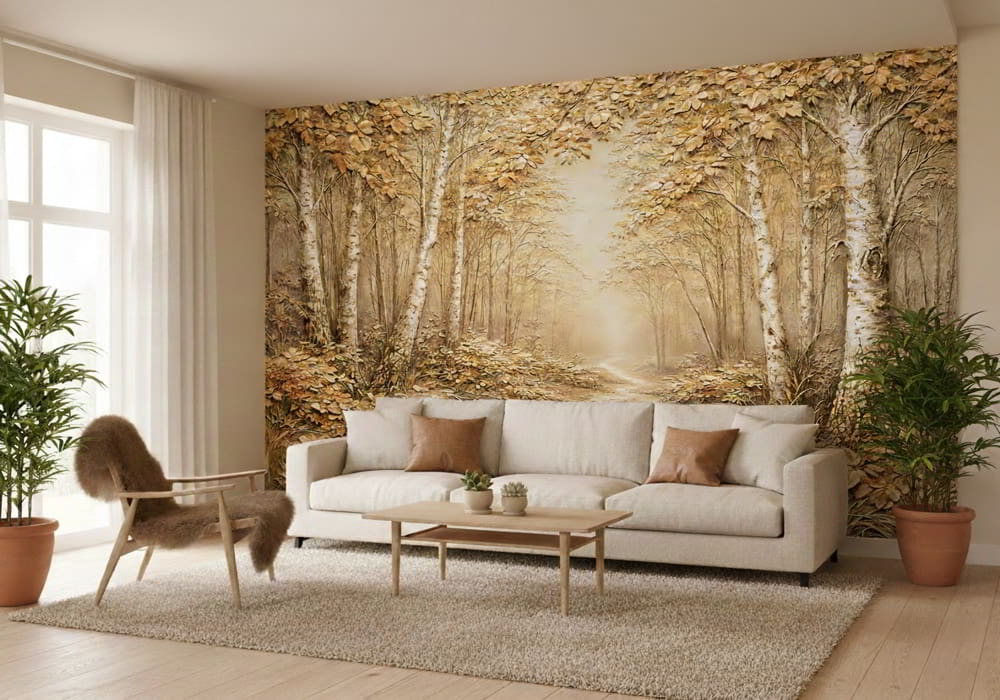 Golden Birch Forest Relief - AI Art Wall Mural for Contemporary Interiors