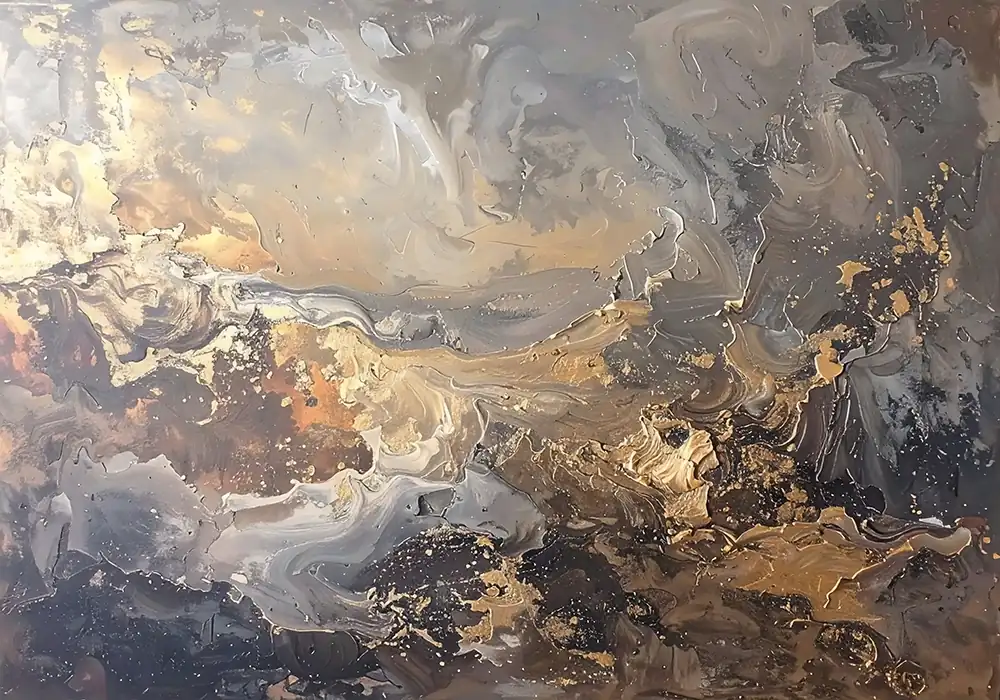 Flowing golden clouds merging with mineral textures in layered abstraction. Warm luminosity with ref..