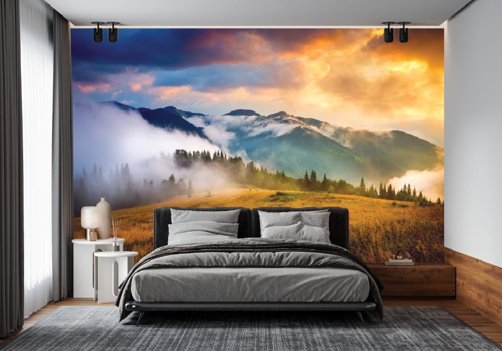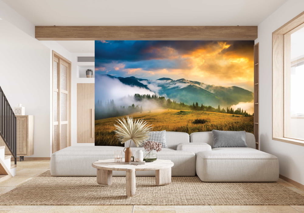 Transform your room into a tranquil retreat with the Mountain Landscape with Fog & Haystack Wall Mural. Featuring lush organic tones and serene natural perspectives, this design creates an immersive window to the outdoors.Timeless Elegance: Classic & Modern Collection