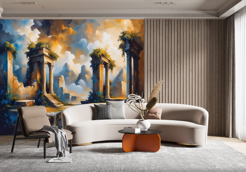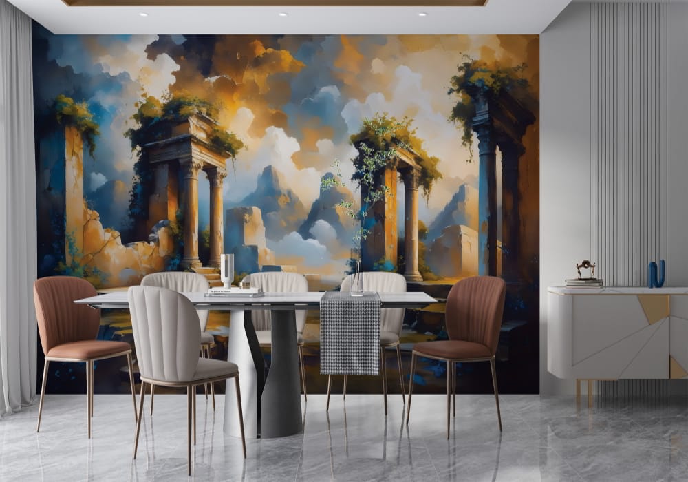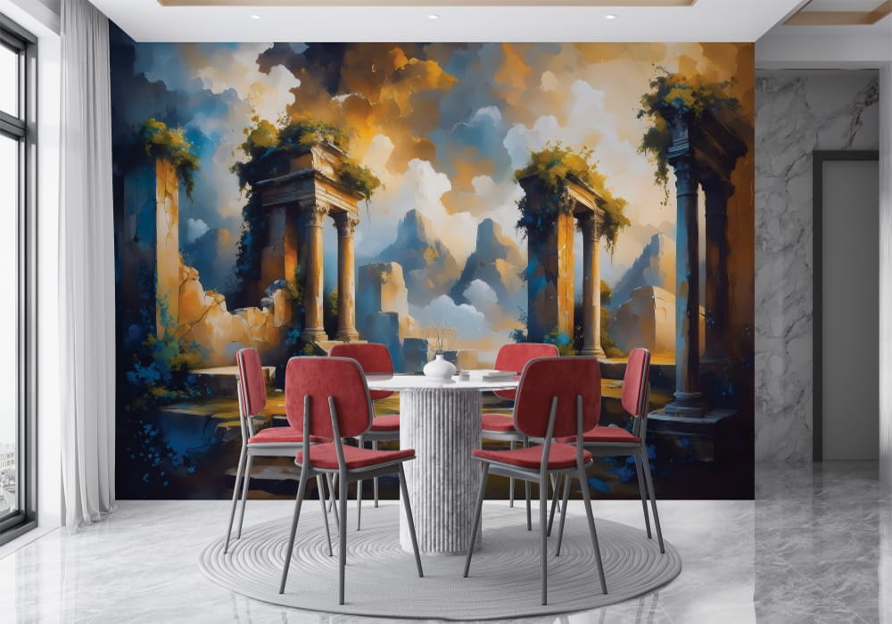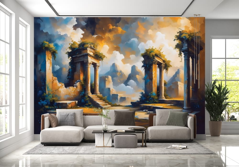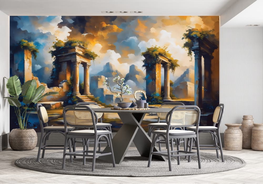 Step back into a reimagined history with Mystical Ancient Ruins. This mural uses architectural persp..