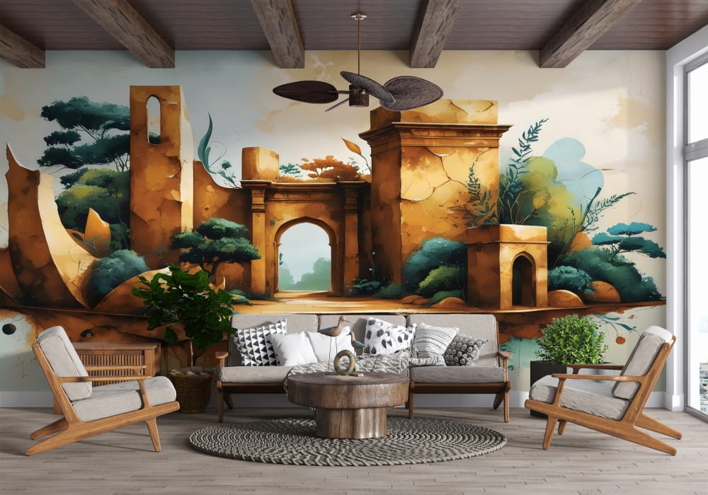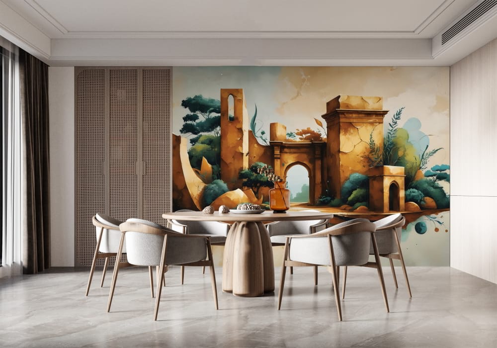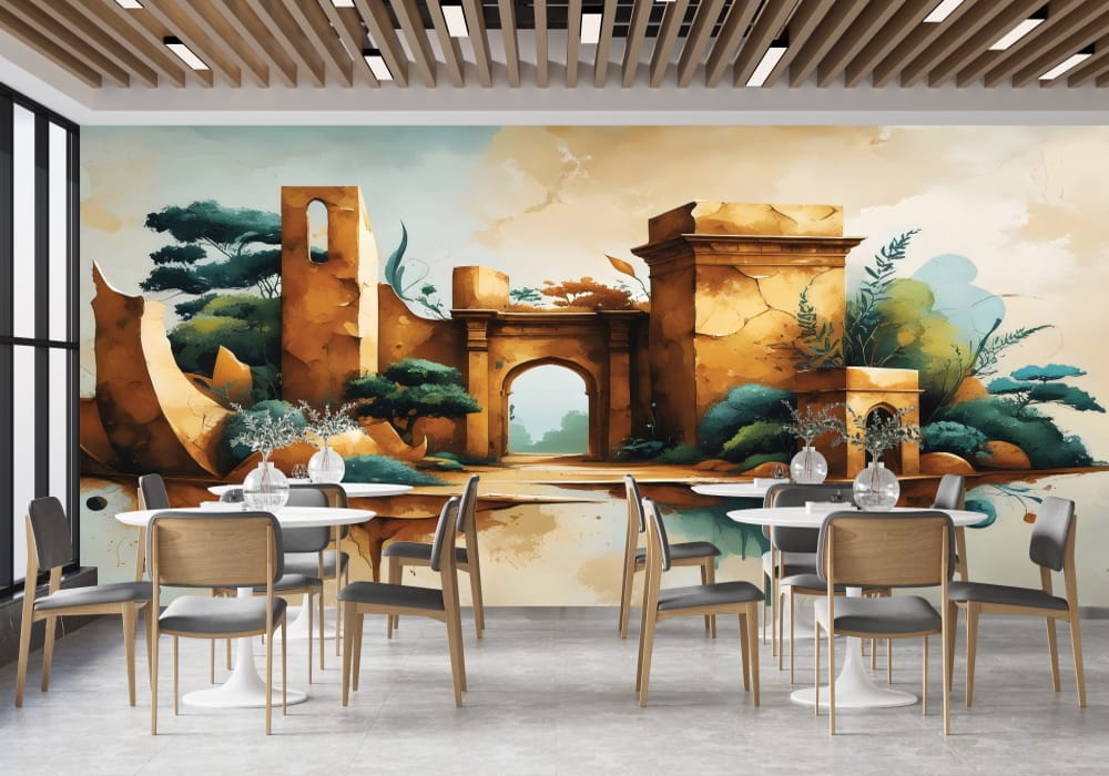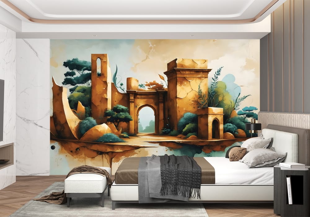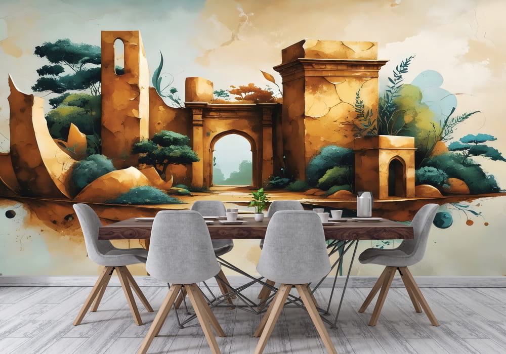 Step back into a reimagined history with Mystical Ancient Ruins. This mural uses architectural persp..