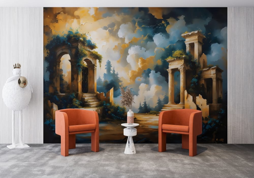 Step back into a reimagined history with Ancient Greek Temple Ruins. This mural uses architectural p..