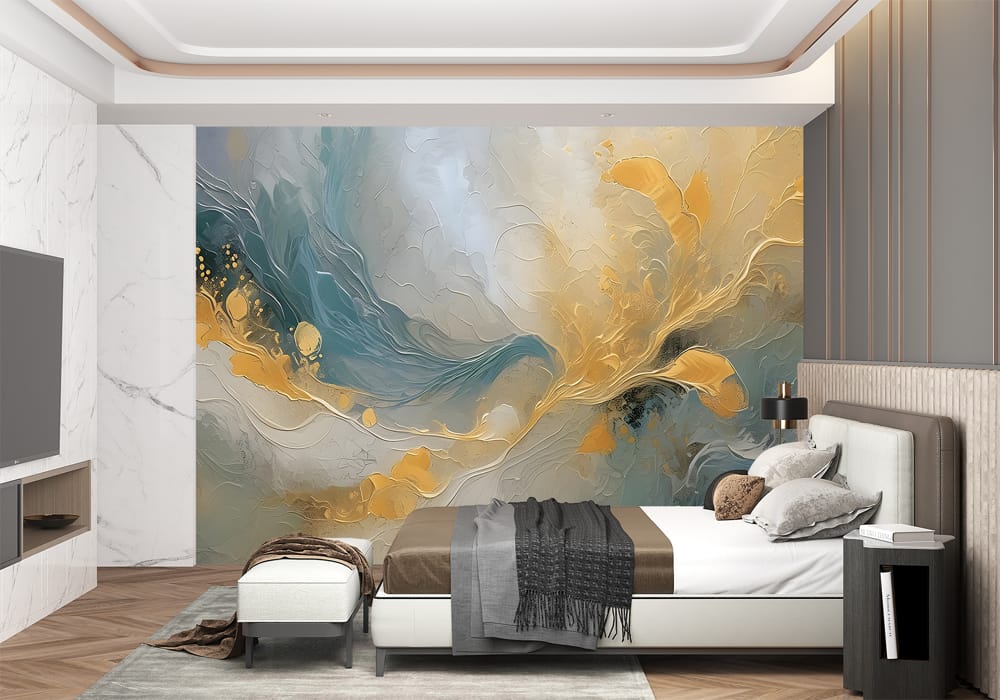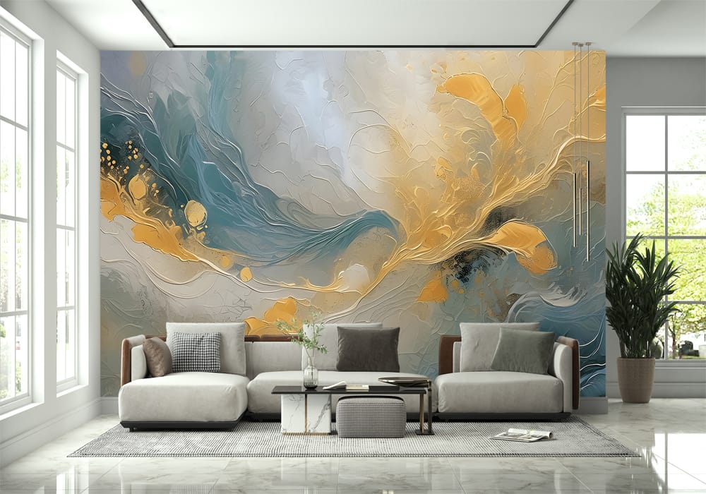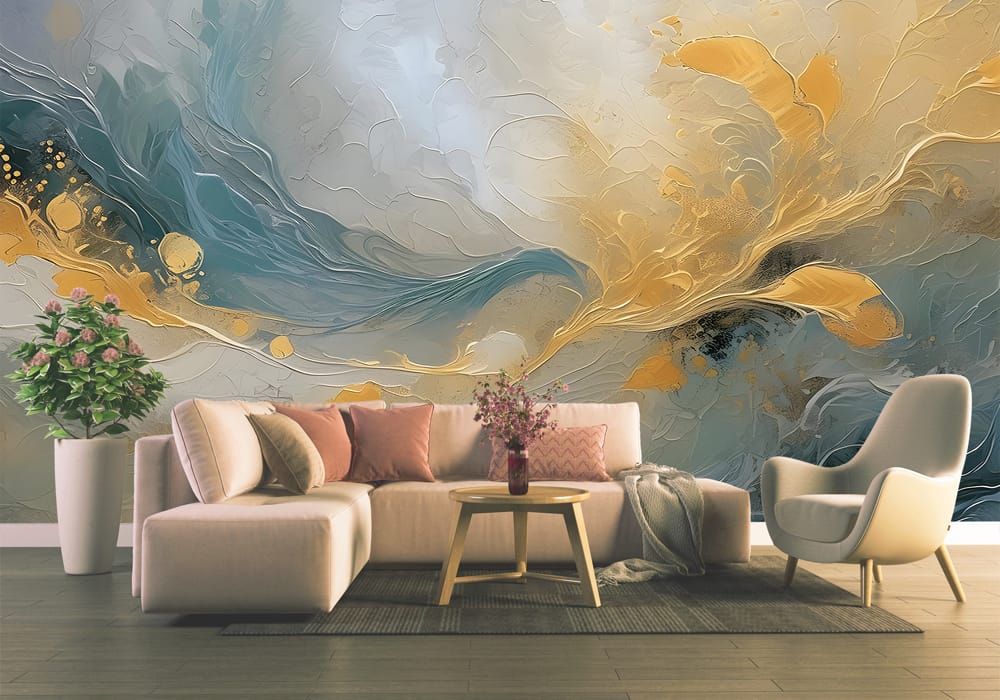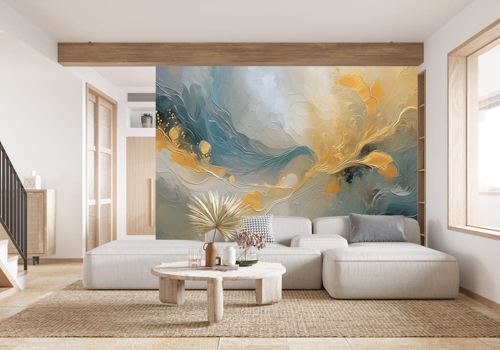 Enhance your interior atmosphere with the unique perspective of Golden Flow. This AI-generated mural..