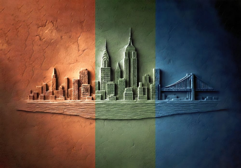 Experience the energy of the metropolis with Manhattan Facets. This mural reinterprets urban structu..