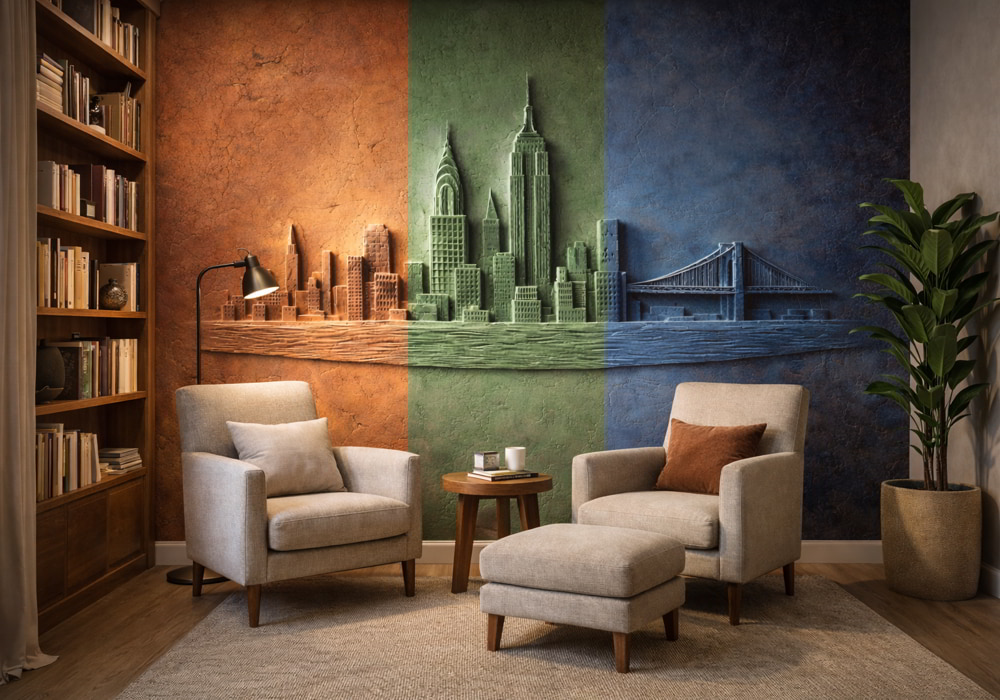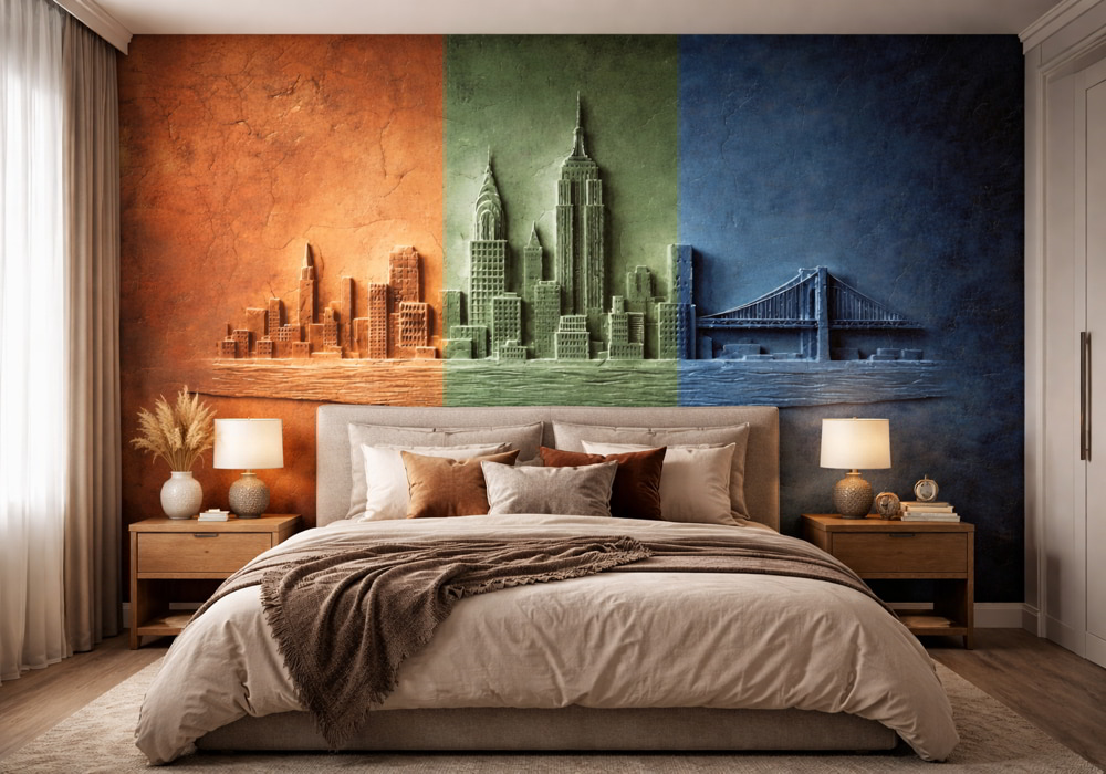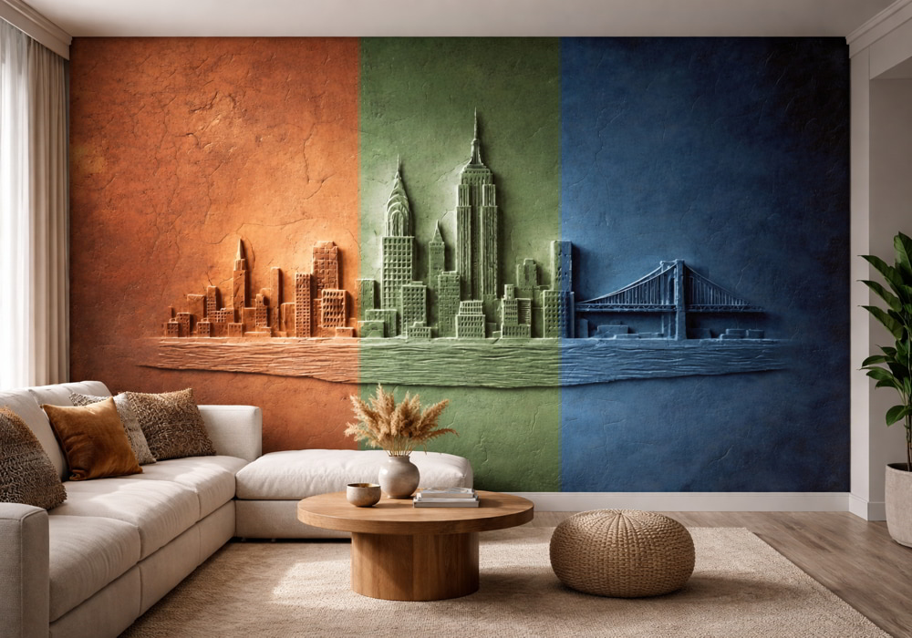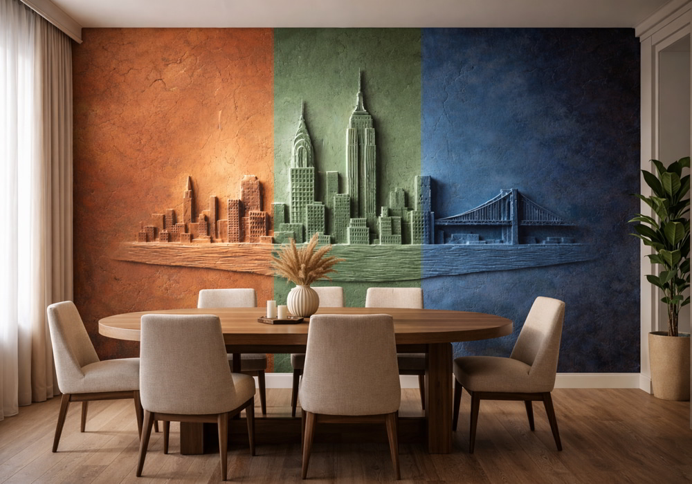 Reimagine the urban landscape with Chromatic Skyline Relief. This AI-generated mural presents the ci..