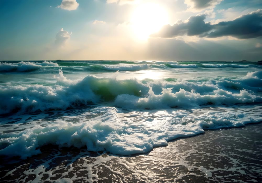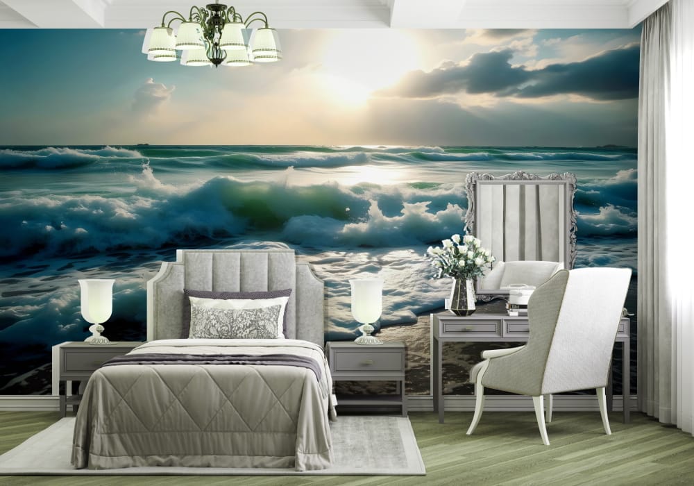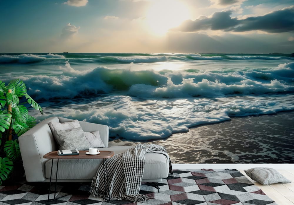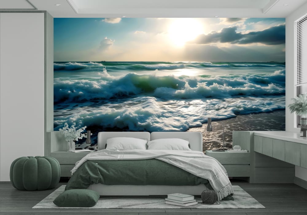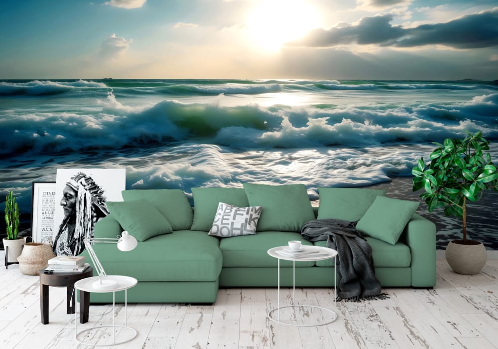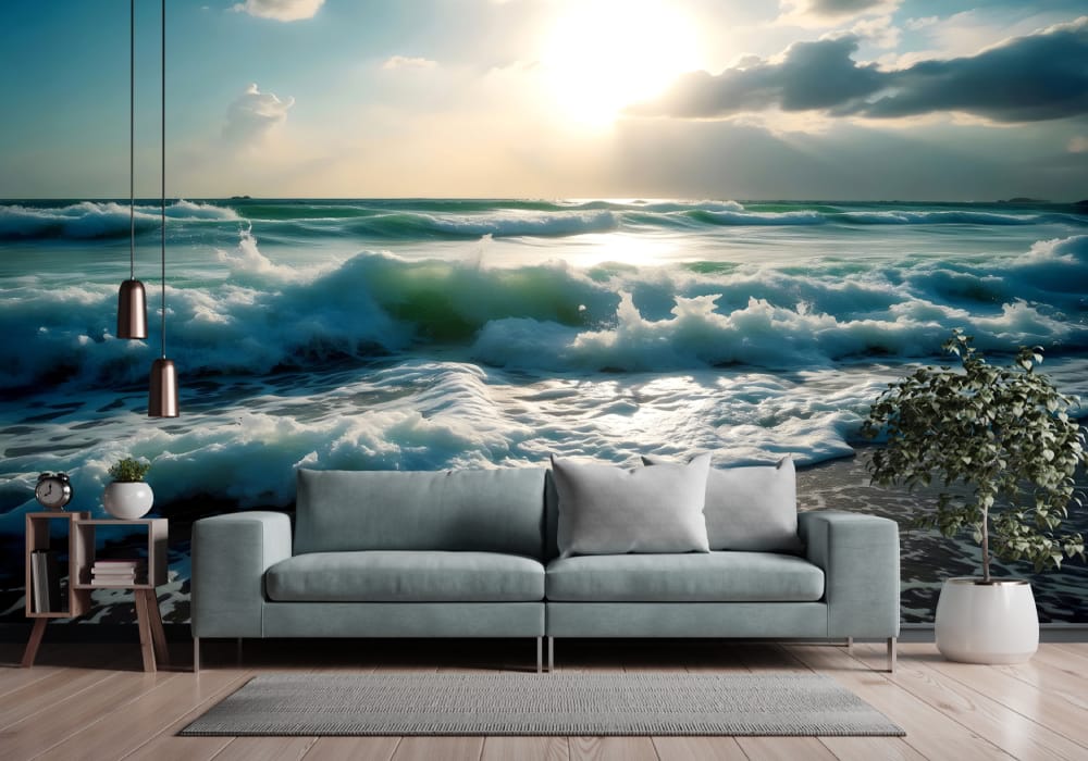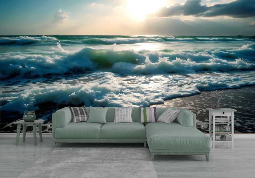 Emerald Glow Ocean Waves - AI Art Wall Mural for Contemporary Interiors