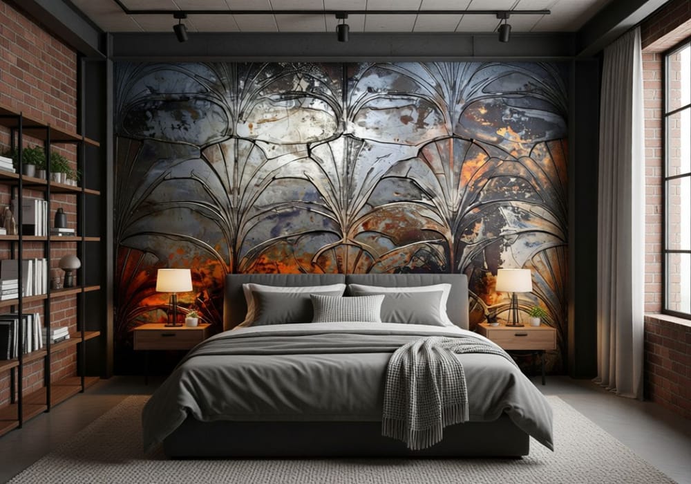 Floral Echoes in Metal - AI Art Wall Mural for Contemporary Interiors