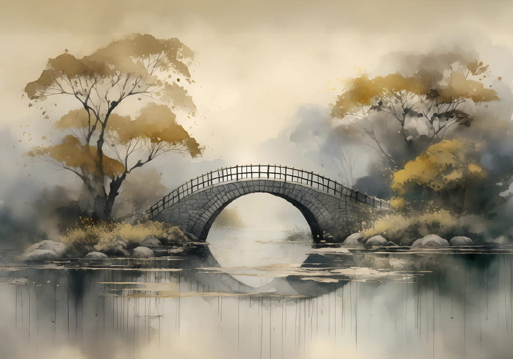 Create a sense of journey and tranquility with the Stone Bridge Over Peaceful River. This algorithmi..