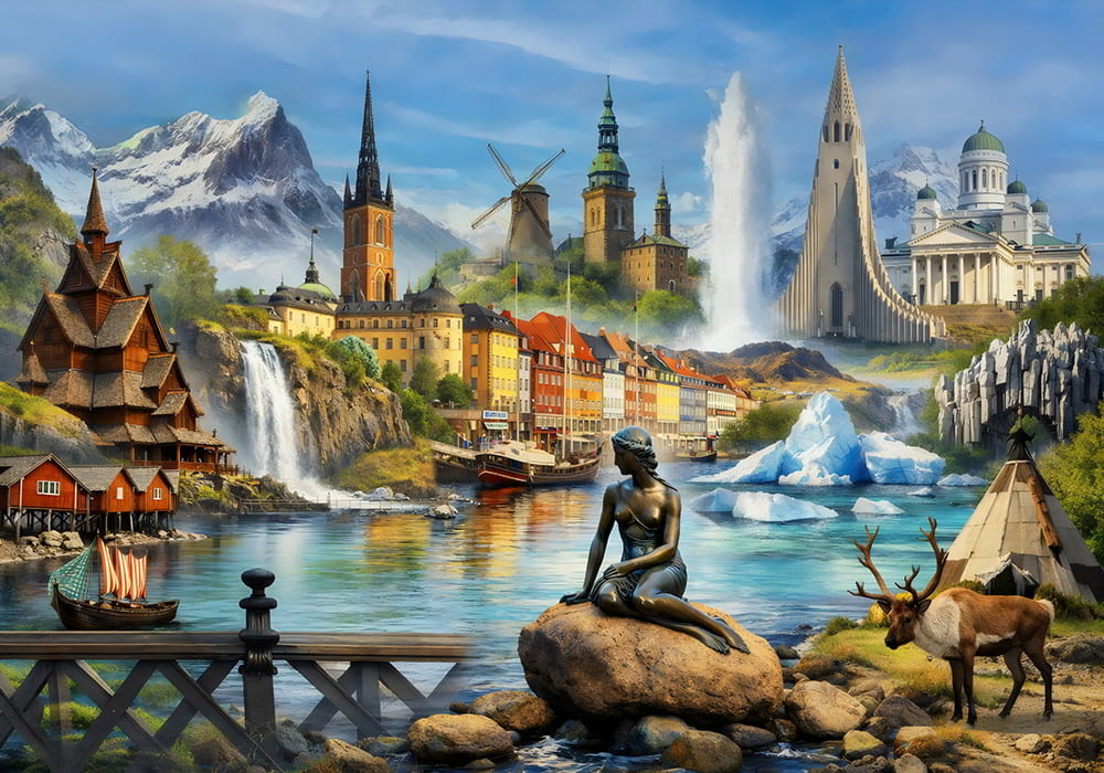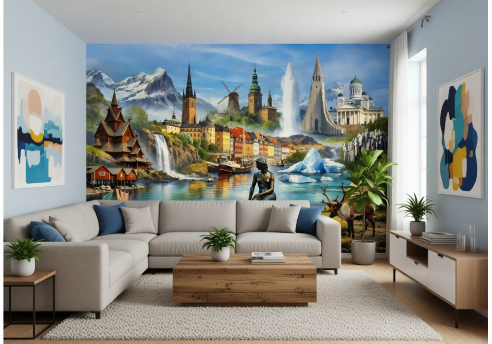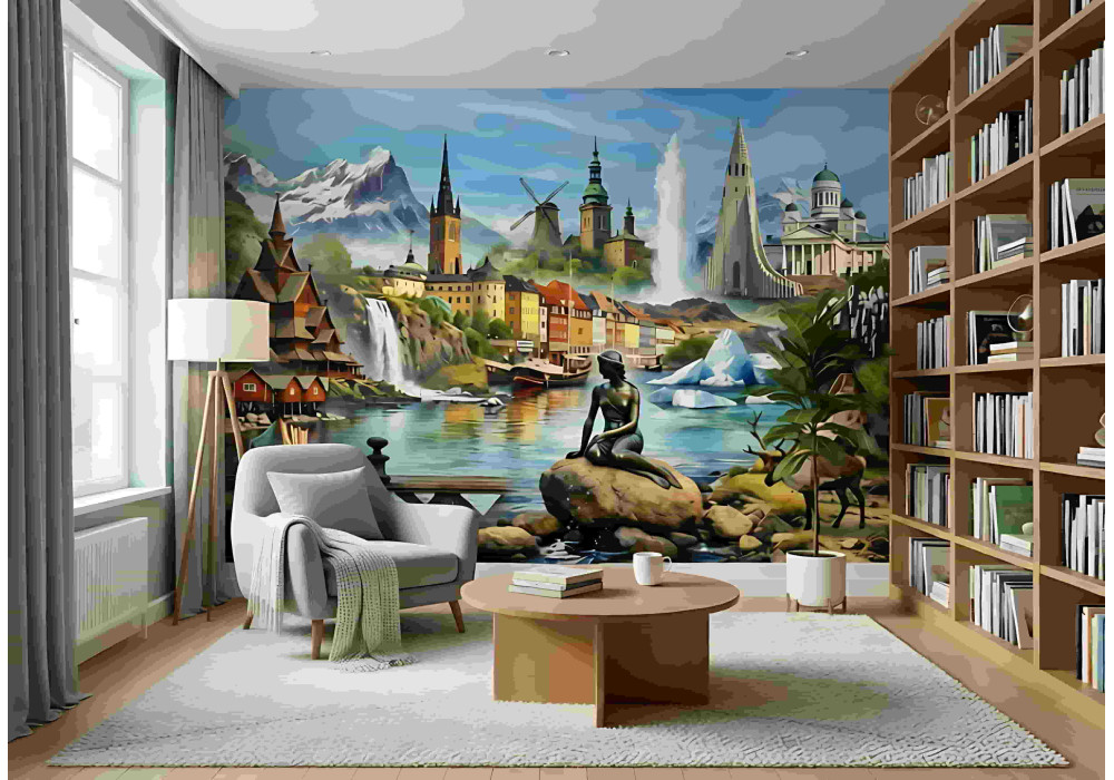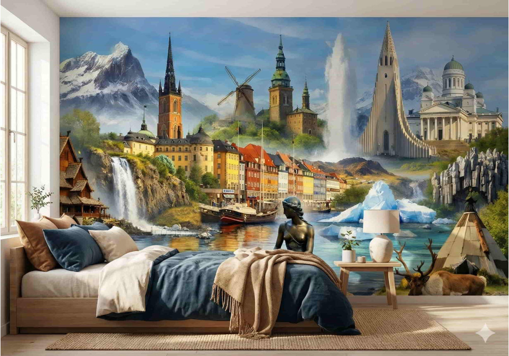 Nordic Mythic Journey Scandinavian Landmarks Fantasy Collage - AI Art Wall Mural for Contemporary Interiors