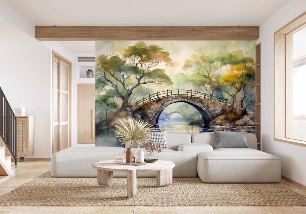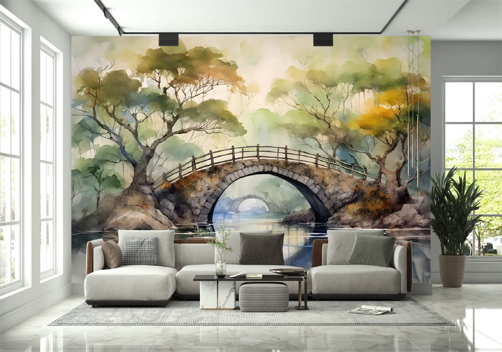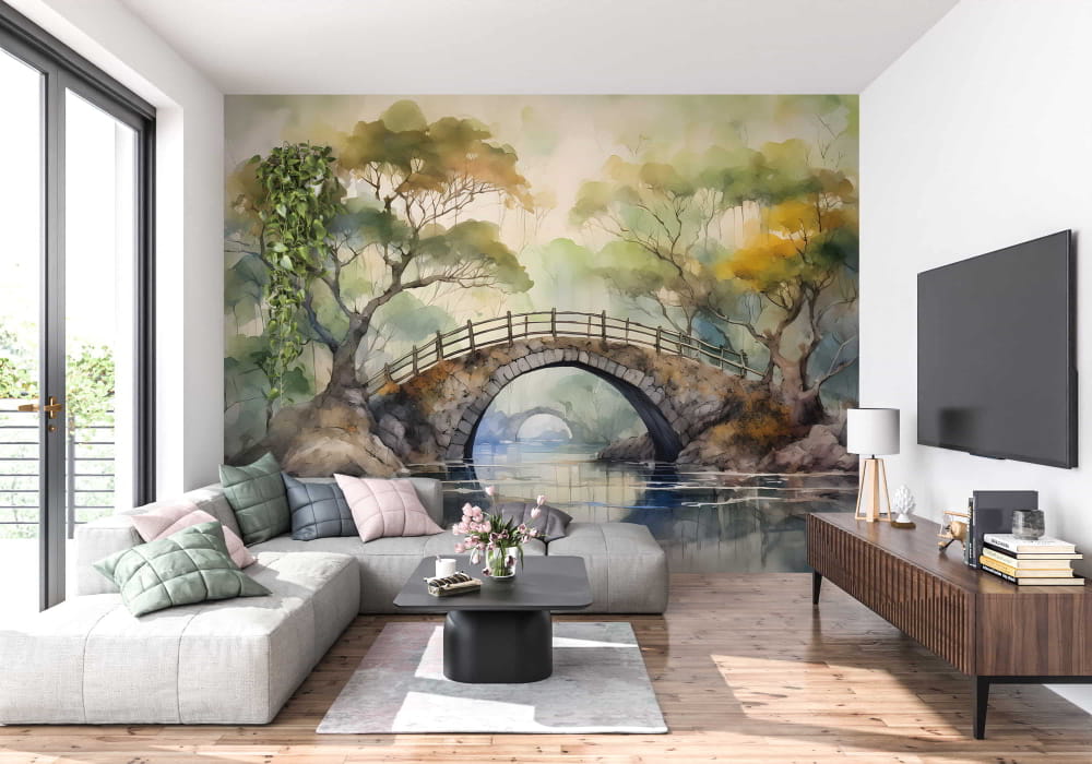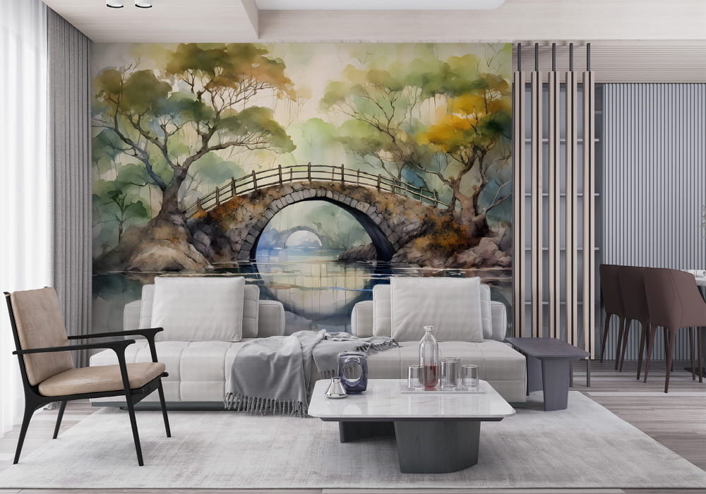 Stone Bridge Over Peaceful River Mural - AI Art Wall Mural for Contemporary Interiors